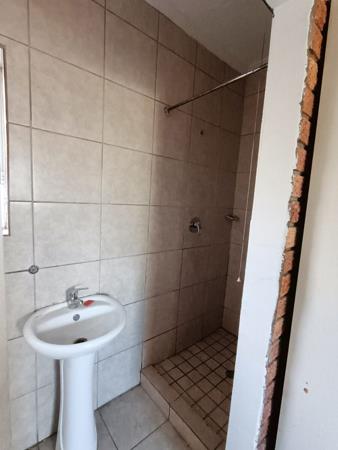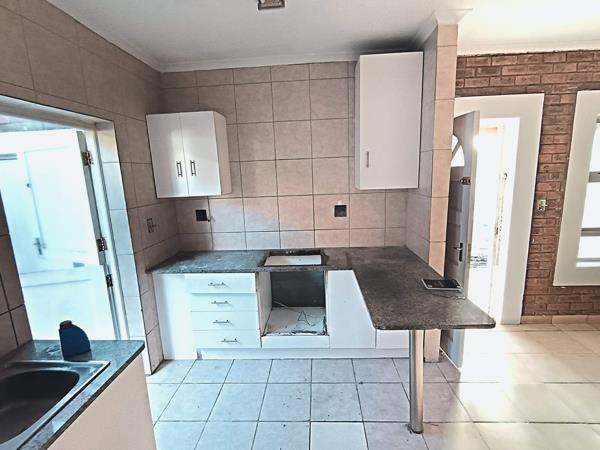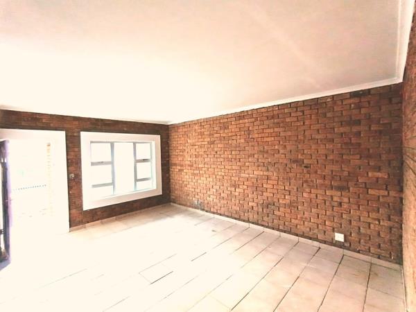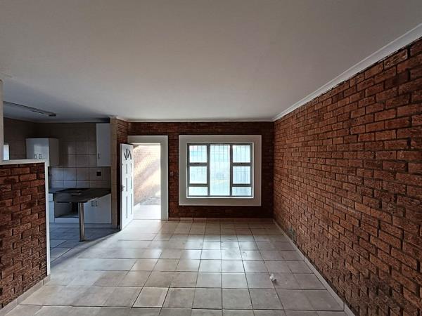 Inside, the home presents an open-plan living space characterised by striking exposed brick walls and practical tiled flooring, allowing for ample natural light through large windows. The layout includes a dedicated lounge and dining room, offering flexibility for various living arrangements. The kitchen areas, while functional, are ready for customisation, featuring modern white cabinetry, tiled walls, and dark granite-look countertops, awaiting final fittings to become a culinary hub.