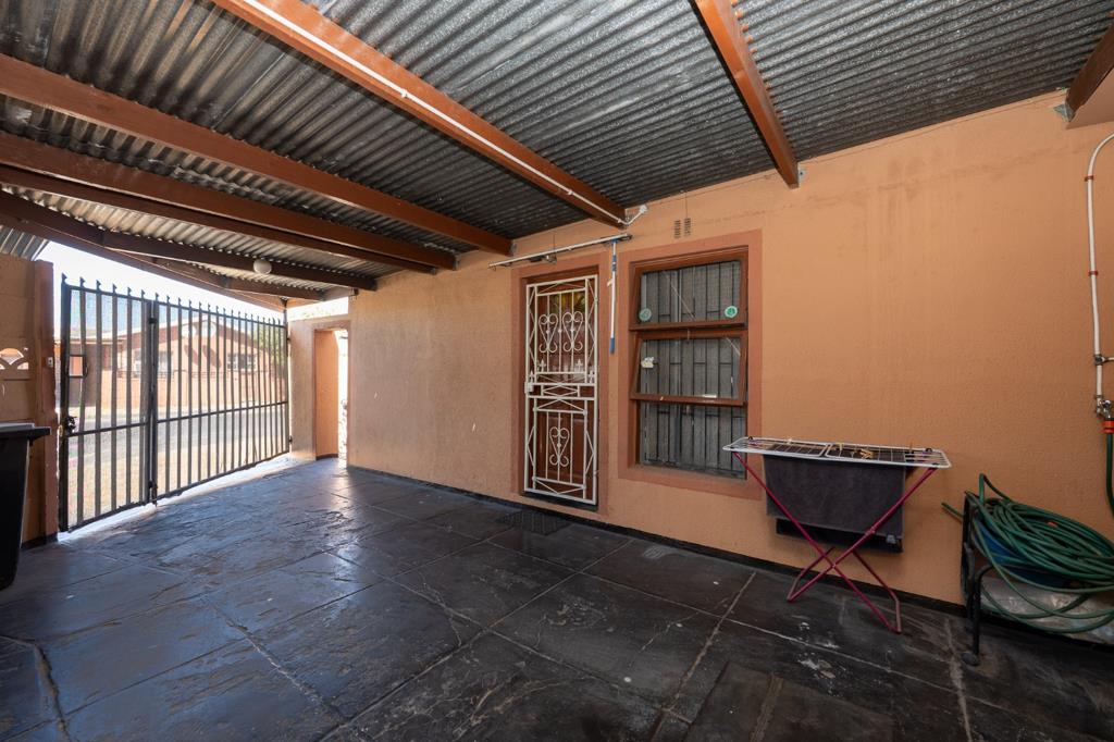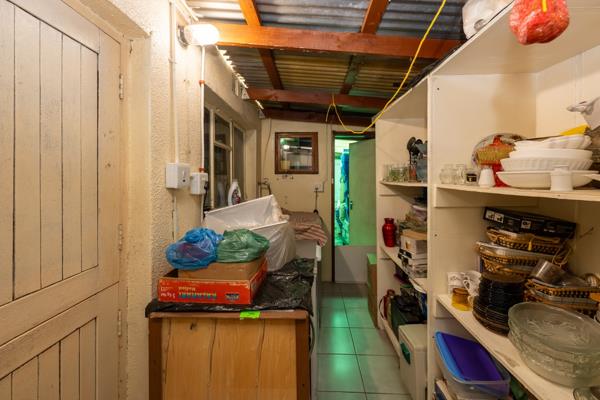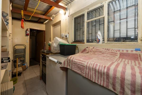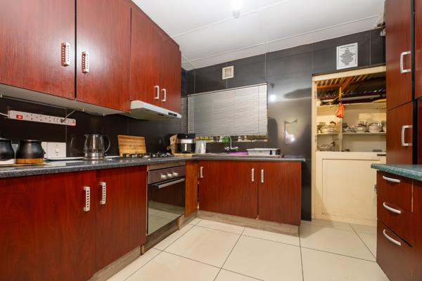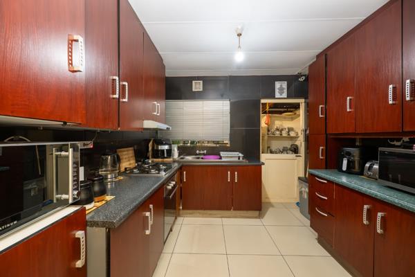 The open-plan lounge and dining room boasts tiled flooring and a welcoming flow, ideal for both relaxation and family gatherings. The kitchen features elegant dark wood cupboards, a fitted oven with a gas stove top, and a practical layout that opens to a convenient storage and laundry area.