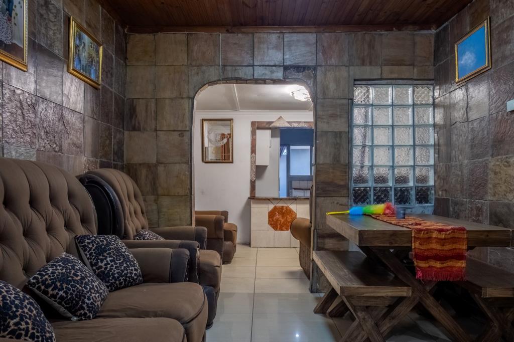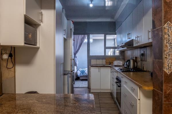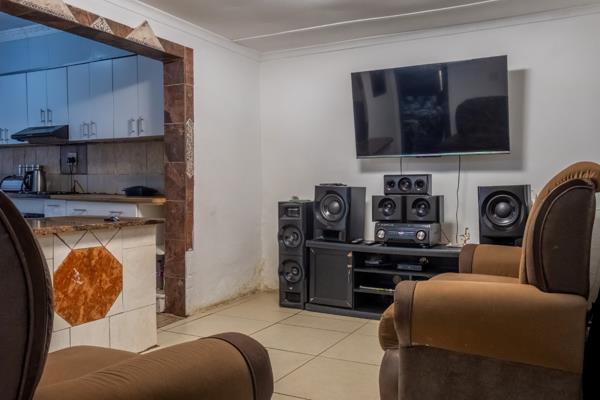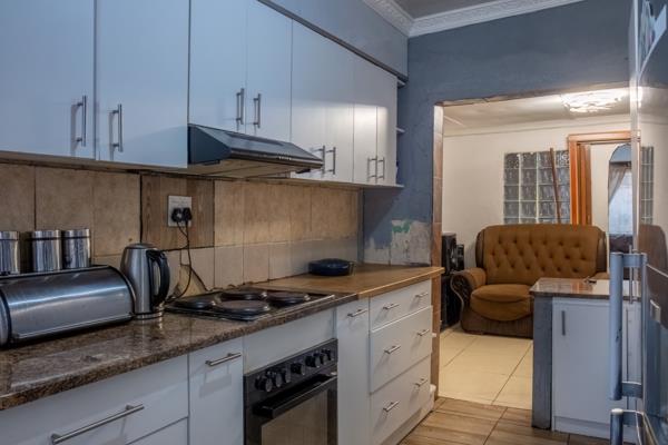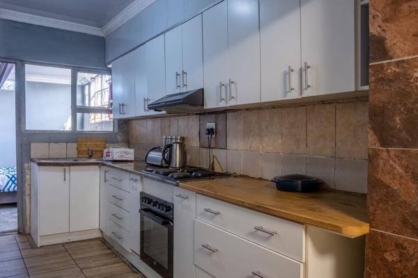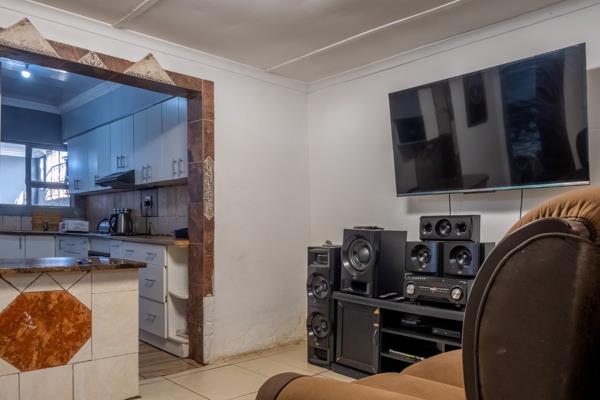 The inviting lounge features neat tiled flooring, offering a low-maintenance and stylish space to relax or entertain guests. The lounge flows to the dining room with a breakfast counter. The kitchen is well-appointed, with ample cupboard space to ensure plenty of storage for all your culinary needs. It includes a fitted stove and oven, along with designated space for a fridge, making meal preparation both convenient and enjoyable.