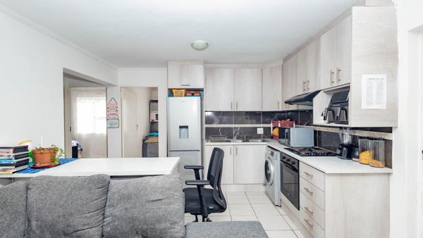The apartment features three well-defined bedrooms, two of which include built-in cupboards. Tiled flooring runs throughout the home, adding to the modern, low-maintenance appeal.