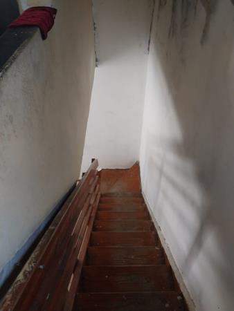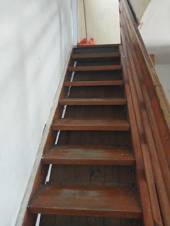 A wooden staircase leads upstairs.
