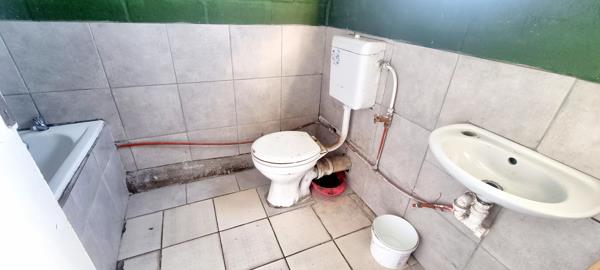 Kitchen and family room. Bathroom with bath, toilet, and basin.