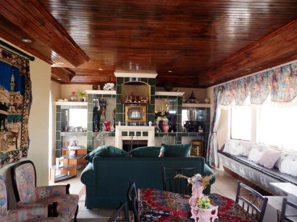 Large tiled lounge with knotty pine ceilings and fireplace
