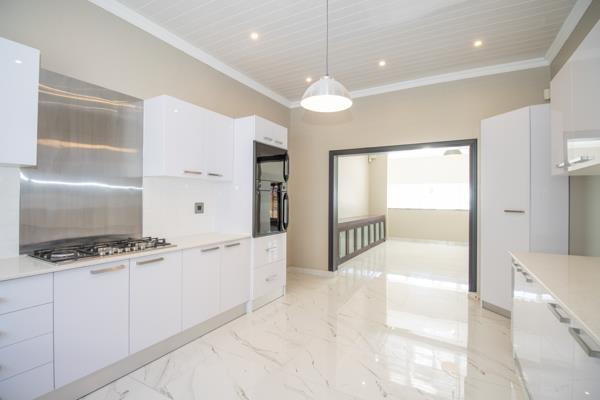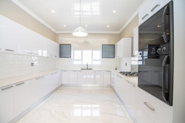 Prepare to be impressed by this culinary masterpiece. The spacious kitchen features elegant ceasar stone countertops and a seamless flow of large porcelain tiles that extend beautifully from the living room. A convenient eye-level double oven, a professional-grade five-plate gas hob, and a sleek black sink. The crisp white cabinetry offers ample storage, completing the modern, sophisticated look.