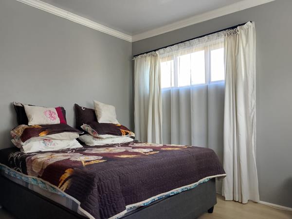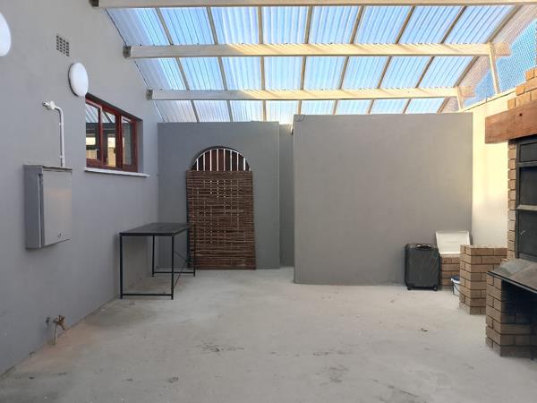 The home is perfectly laid out where theounge flows into an outside but covered braai area. The carport can accommodate up to 3 cars easily. The bathroom is. extremely neat and has a walk in shower and basin. There are 2 rooms with BIC and only 1 without. The kitchen is fairly large with fairly new cupboards and this leads into the carport. In additon, the lounge leads into the braai area through a double sliding door.