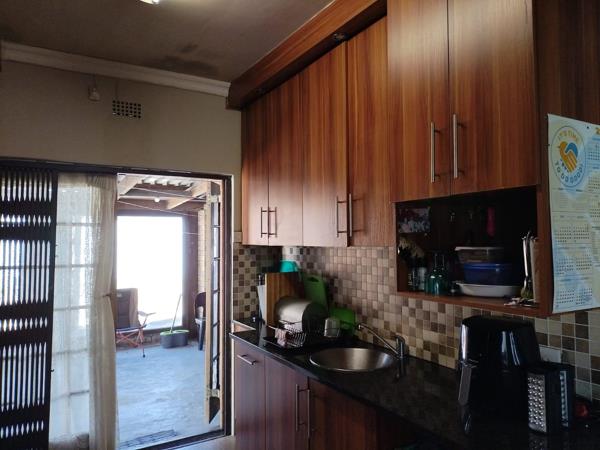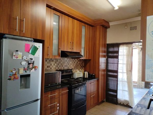 The heart of the home is the lovely open kitchen, equipped with a freestanding stove, extractor fan, built-in cabinets, and a single bowel sink. The open kitchen flows seamlessly into the spacious open-plan dining and lounge area, perfect for entertaining. Laminate flooring in the lounge and tiles in the dining room add warmth and style.