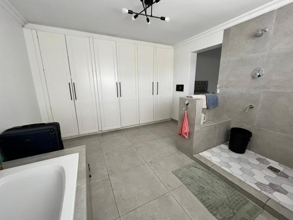 This stunning 4-bedroom main house features four spacious bedrooms, two modern bathrooms- the main en-suite in complete elegance with showers, double basin and a bath while the family bathrooms include a shower, toilet and bath. A seamless open-plan design that integrates the kitchen and lounge, creating a spacious and inviting atmosphere perfect for modern living, sleek built-in-cupboards offering ample storage and a clean, uncluttered look with a stylish oven hob set into the counter, blending fuctionality with contemporary design.