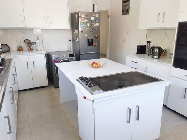 The kitchen is modern and functional, fitted with white shaker-style cupboards, light countertops, and a marble-look backsplash. An island with an electric hob provides additional workspace, and there is sufficient cupboard space for storage. The kitchen layout also allows space for a large refrigerator and a washing machine. A separate dining room provides a dedicated area for family meals or entertaining.