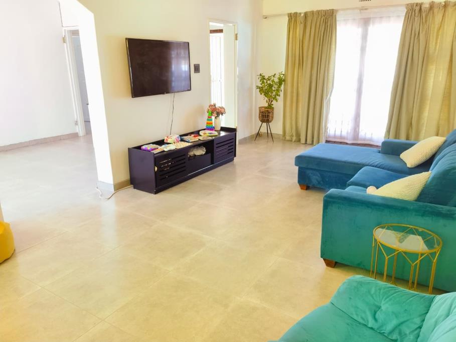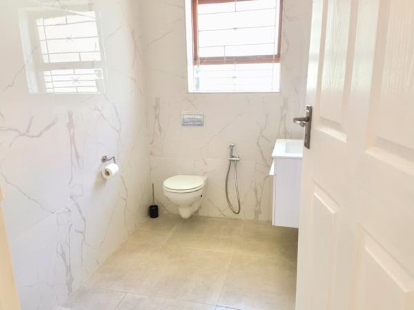 The home offers three bedrooms, each with comfortable proportions. One bedroom features hardwood flooring, while the others continue the tiled finish. Large windows allow for good natural light, and burglar bars are fitted for added security. The main bedroom includes an en-suite bathroom, while the second bathroom is finished with modern wall and floor tiles, a vanity, and a wall-mounted toilet with a bidet spray.