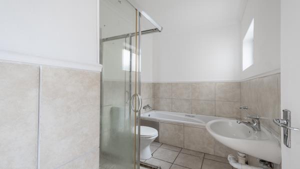 Upstairs, youll find two well-sized bedrooms, both fitted with built-in cupboards, offering ample storage space. The family bathroom includes a bath, shower, toilet, and basin.