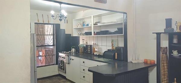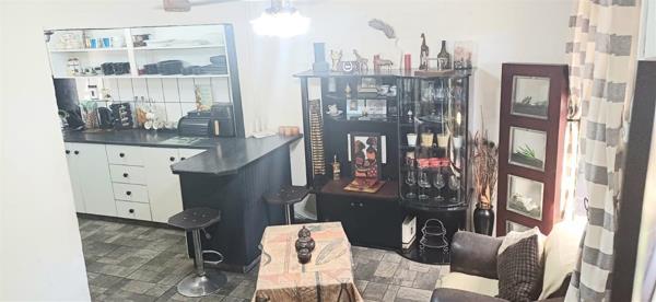 The kitchen is tiled and fitted with built-in cupboards, built-in shelving, a built-in stove, and space for a fridge and just opposite there is a scullery, offering additional cupboard space and a washing machine connection.