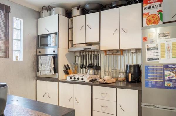 Step inside to an open-plan tiled lounge and dining area, seamlessly flowing into a fitted kitchen designed for easy hosting and everyday comfort. A discreetly positioned guest toilet adds practicality to the ground floor layout. The backyard is ideal for leisure, featuring a built-in braai and a versatile temporary storage area that can double as extra living or entertainment space.
