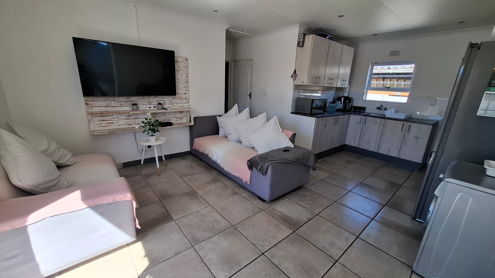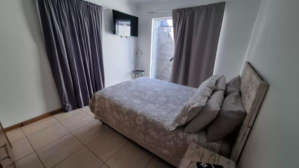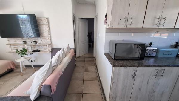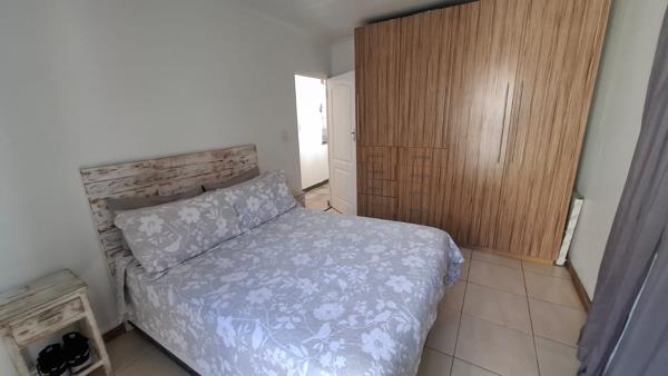 2 of the bedrooms have wardrobes. The family bathroom consists of a corner bath with an overhead shower, basin and toilet. Parking for 1 car in the garage, with space for another car behind sliding gates. Neatly tiled throughout. Burglar bars and security gates all around.