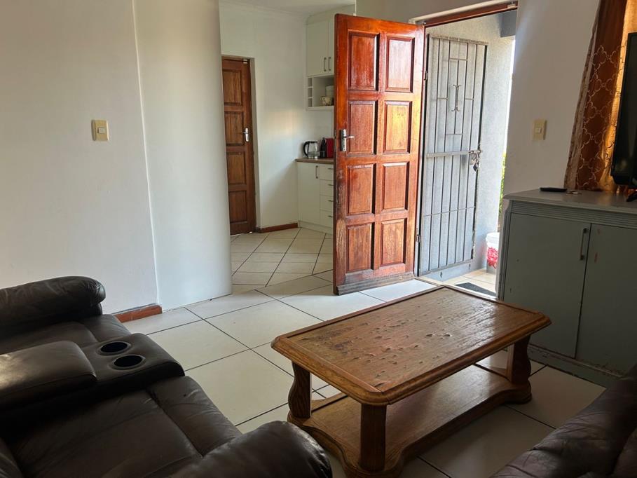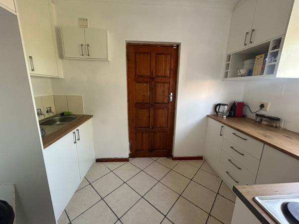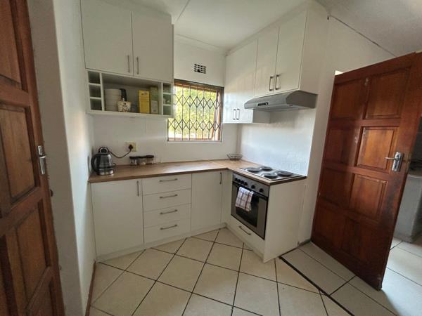 Step inside to a welcoming lounge area, characterized by easy-to-maintain tiled flooring and neutral walls, creating a versatile backdrop for your personal style. Natural light fills the space, contributing to a bright and airy atmosphere. The heart of the home, the kitchen, boasts modern white cabinetry complemented by light wooden countertops, offering ample storage and a clean aesthetic. It comes equipped with a built-in stove and extractor fan, catering to your culinary needs.