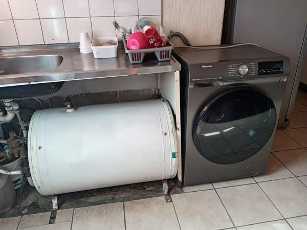 Inside, the residence comprises three comfortable bedrooms and a single bathroom, catering to family living. The layout includes a dedicated lounge area, complete with tiled flooring and ample natural light, providing a functional space for relaxation. The kitchen, while currently utilitarian with a stainless steel sink and space for appliances like a washing machine, offers scope for a contemporary redesign to suit your culinary preferences. Visible piping and electrical components suggest an opportunity for aesthetic improvements.