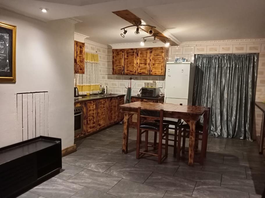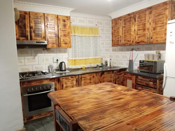 Discover this inviting 3-bedroom, 2-bathroom home located in the established suburb of Eastridge. Spanning a comfortable 182 sqm on an equally sized erf, this residence offers a blend of functional living spaces and distinctive design elements. The heart of the home is its spacious open-plan kitchen and dining area, featuring custom rustic wooden cabinetry that provides ample storage. This area is well-appointed with an integrated oven and gas hob, a double basin sink, and generous countertop space, complemented by modern large-format floor tiles and good overhead lighting. A large wooden island serves as both a preparation area and an additional dining space, fostering a cohesive and welcoming atmosphere for family meals and entertaining.