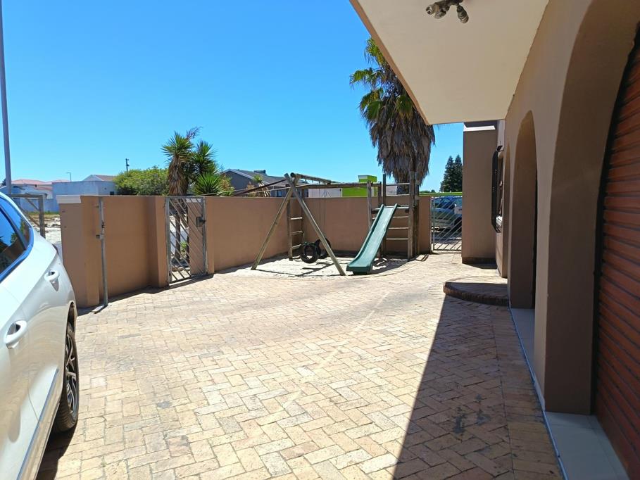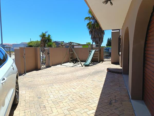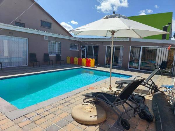 The property includes a separate three-bedroom entrance, ideal for rental income or extended family living. This unit offers an open-plan lounge and modern kitchen with built-in cupboards and a stove. The main bedroom includes built-in cupboards and a sliding door that opens directly onto the swimming pool area.