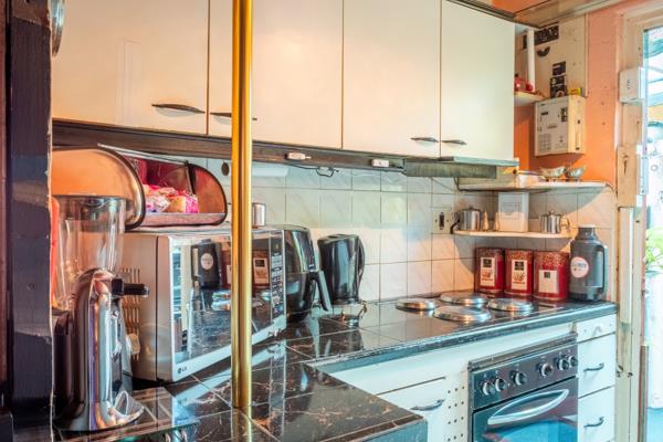 The kitchen offers built-in cupboards and a back door that leads directly into the backyard, adding to the homes functionality. There are two bedrooms, one of which includes built-in cupboards, and they share a neat family bathroom.