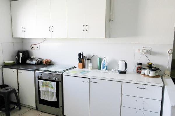 Step into a spacious open-plan lounge and dining area, flowing seamlessly into a fitted kitchen with built-in cupboards. The home features a neat, slightly modern bathroom complete with a shower, toilet, and basin.