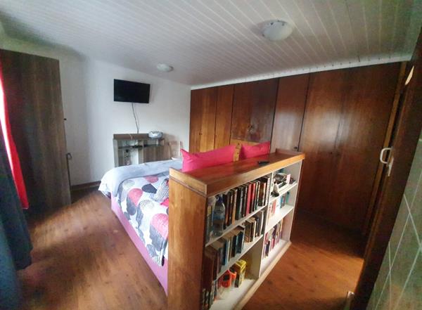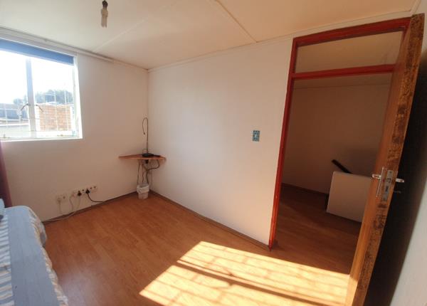 A wooden stairway leads to the spacious upstairs level, which includes an additional study area and a walkway with extra closet space. The ground floor boasts a generously sized, tiled lounge and dining area, complete with a built-in TV entertainment shelving unit. The fully fitted kitchen is equipped with a gas hob and a washing machine outlet.