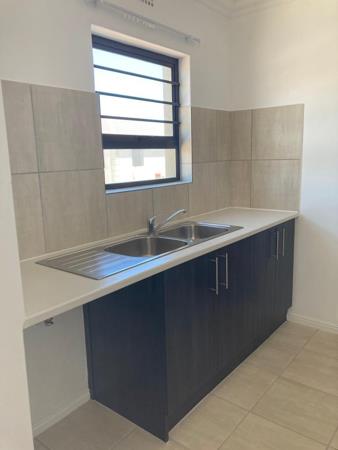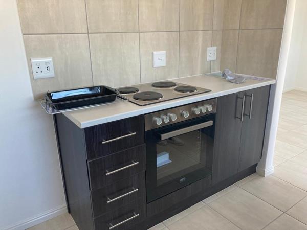 The home features two well-sized bedrooms with built-in cupboards and a bright, airy lounge that creates a warm and inviting atmosphere. The kitchen is fitted with built-in cupboards, a countertop stove, a built-in oven, a double sink, and is plumbed for one appliance, ensuring everyday functionality.