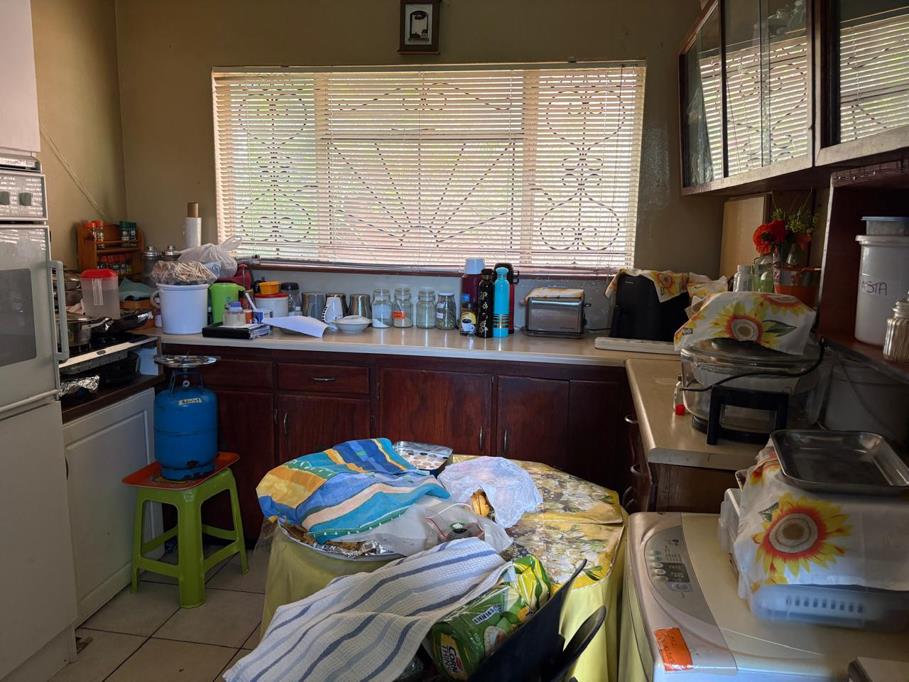 Open-Plan Kitchen and Dining: Raw floor, wooden window frames with burglar bars, and seamless living space. No build in cupboards