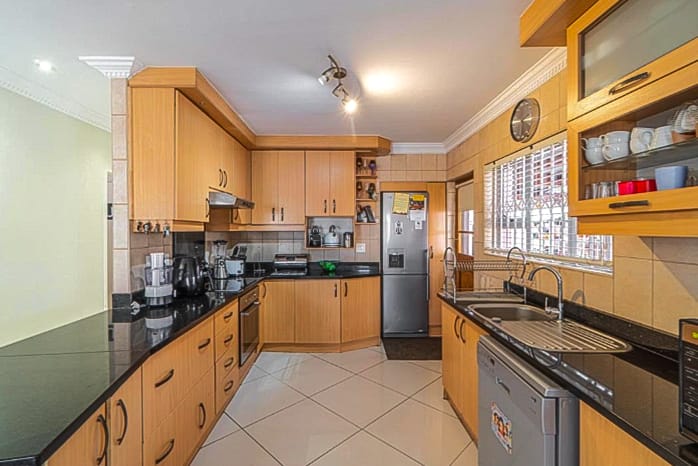 Open plan living and dining area flowing seamlessly into a modern fully fitted kitchen with built-in cupboards offering ample storage.
