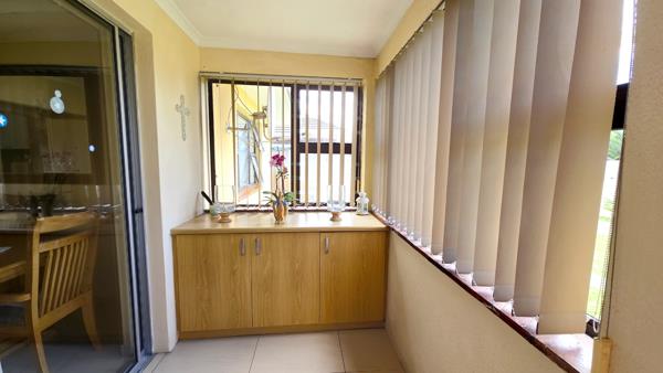 Upon entry, the interior reveals an intelligently designed layout featuring a spacious lounge and a dedicated dining room, both benefiting from abundant natural light. The living areas are enhanced by durable tiled flooring throughout, providing a seamless flow in the home. A distinctive natural stone feature wall adds character to the dining space area, which connects effortlessly to the kitchen. An enclosed balcony or sunroom, complete with built-in cabinetry, offers additional versatile living space, ideal for relaxation or a home office.