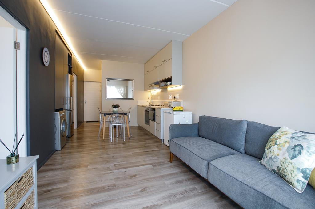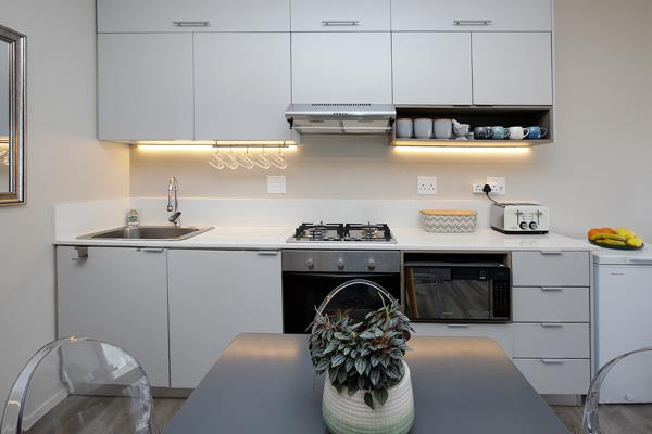 Open-plan kitchen and lounge. Additional cupboards were added in the kitchen.