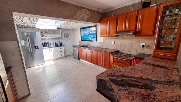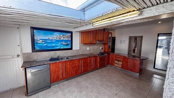 The open-plan kitchen is fitted with built-in cupboards, oven and stove, and boasts a beautiful skylight roof with a ceiling blind.