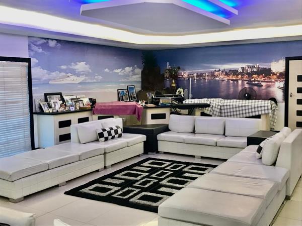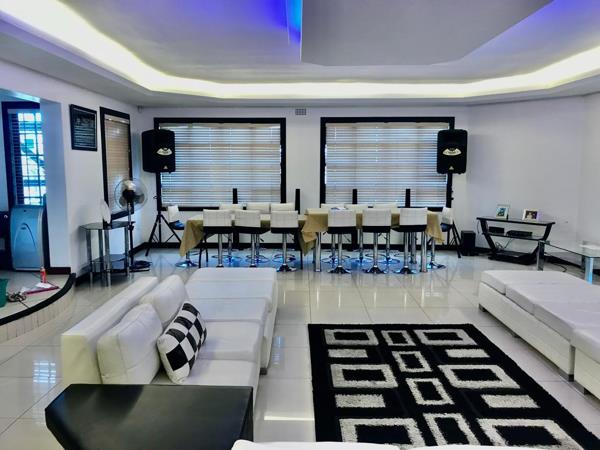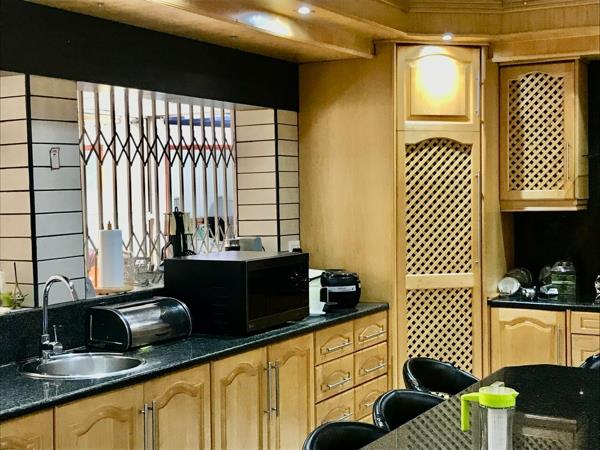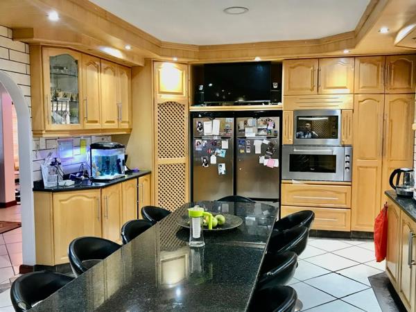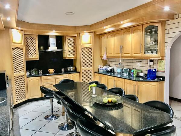 The interior unfolds into expansive, open-plan living areas featuring contemporary aesthetics with tiled floors and recessed lighting. A bar-style dining area and a comfortable lounge with a large U-shaped sectional provide ample space for relaxation and entertaining. The residence uniquely offers three distinct kitchens, each equipped with ample cabinetry, dark granite countertops, and modern appliances, including a large island in the main kitchen. This configuration, coupled with three ensuites, highlights the property''s exceptional potential for dual living or generating rental income through its integrated flatlet.