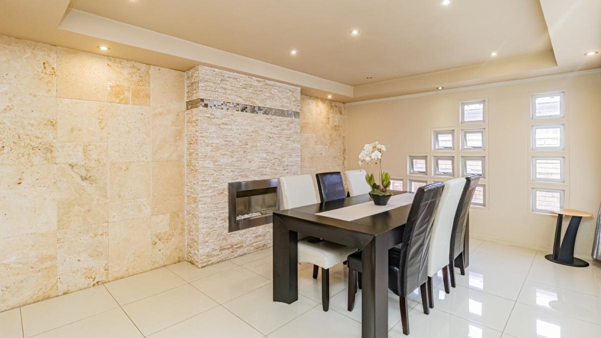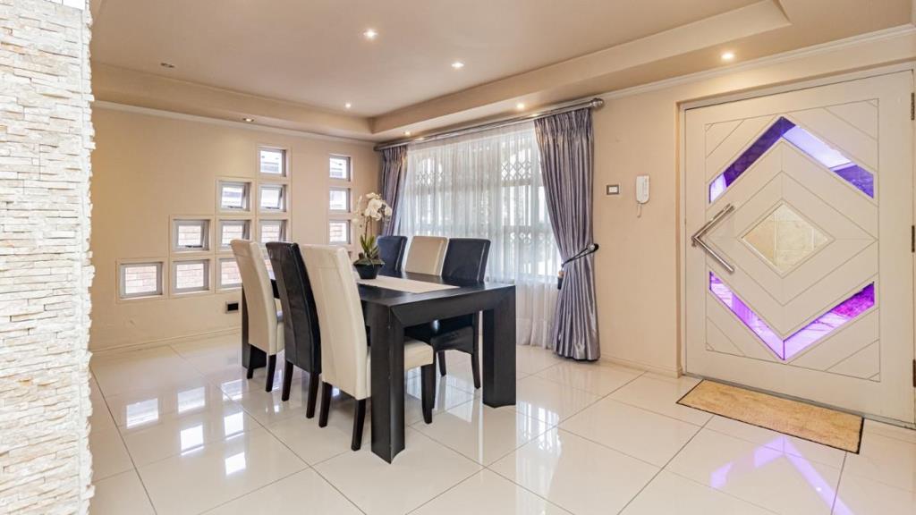The lower level offers four generously sized bedrooms, all fitted with built-in cupboards, while the main bedroom features a private en-suite bathroom. A full family bathroom serves the remaining bedrooms. The home boasts a well-sized kitchen equipped with oven and stove, flowing into an open-plan dining area, perfect for family meals and gatherings.