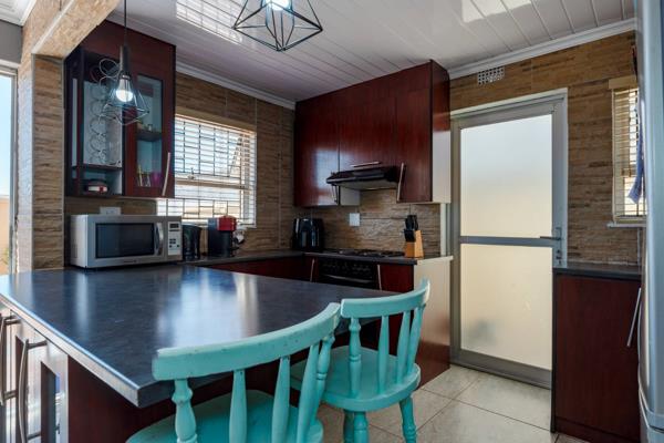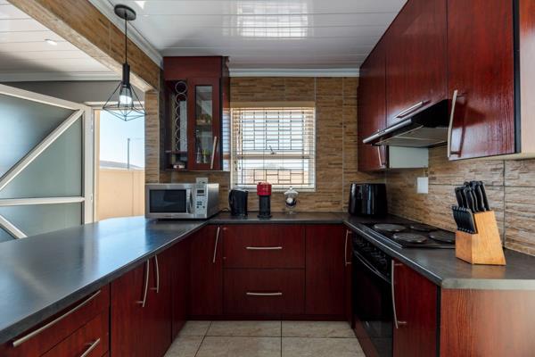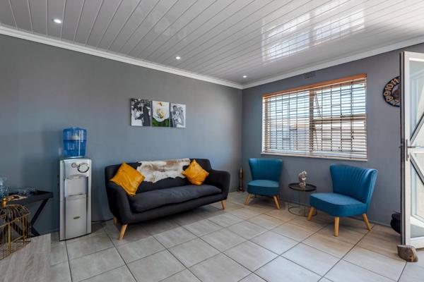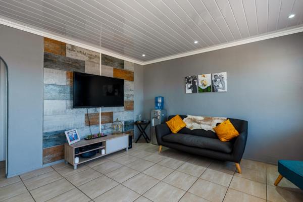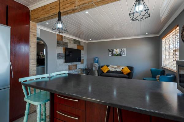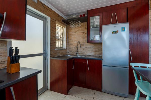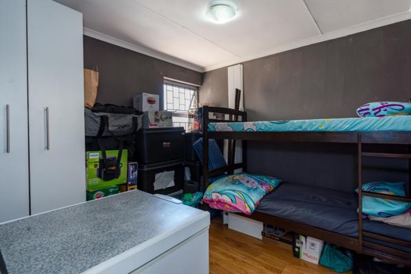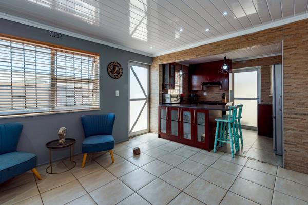 The main house features a neat open-plan kitchen and lounge area, fully tiled and offering ample built-in cupboard space for convenient storage. The home boasts three well-sized bedrooms, all fitted with built-in cupboards and laminated flooring. The main bedroom is generously sized and enhanced with a stylish feature wall. A full family bathroom completes the main house, fitted with a sunken bath, shower, toilet, and basin.