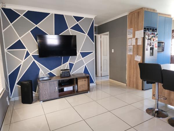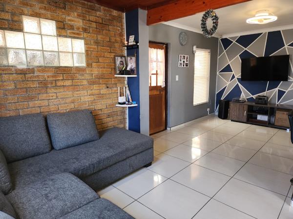 Discover this inviting 4-bedroom, 1-bathroom residential sale property nestled in a tranquil cul-de-sac in Strandfontein Village, Mitchells Plain. The durable brick-faced exterior, complemented by a paved driveway and security features like burglar bars, offers a solid foundation. Inside, an open-plan living area features a distinctive geometric accent wall and tiled flooring. Natural light streams through a large window and glass block inserts, highlighting unique exposed brick and warm wooden ceiling beams.