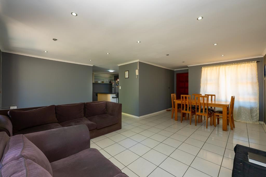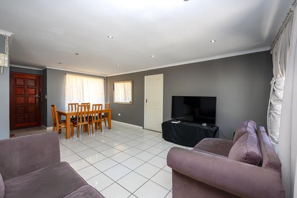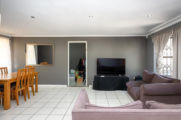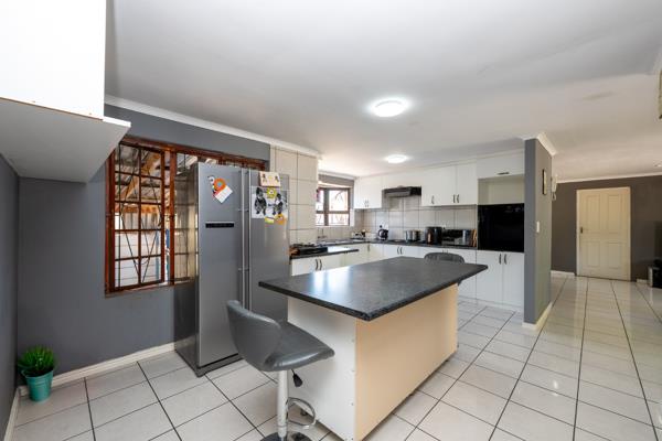 The home welcomes you into a generously sized open-plan lounge and dining room, featuring tiled flooring and a bright, airy atmosphere. The lounge is fitted with double doors that lead out to the spacious backyard, creating a seamless indoor-outdoor flow. The well-sized kitchen offers ample light-wood cupboards, an eye-level oven and hob, space for a fridge, and a convenient centre island perfect for meal prep or casual dining.