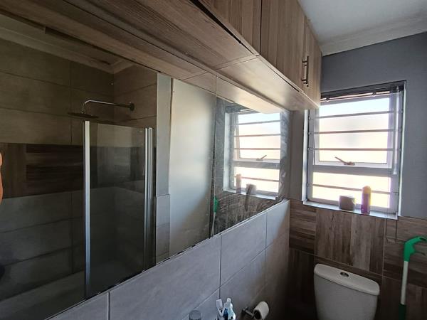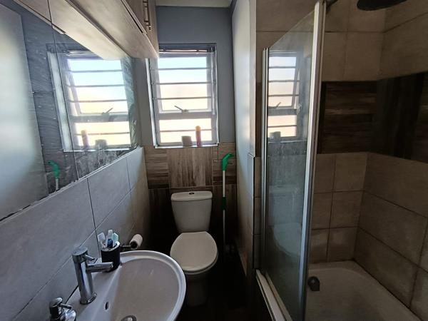 Accommodation comprises two well-proportioned bedrooms, each fitted with spacious built-in wardrobes and laminate wood flooring for a warm, inviting feel. The single bathroom is designed for functionality and style, featuring a modern glass-enclosed shower with a rainfall showerhead, alongside a combination showerbathtub. Two windows with security bars ensure natural light and enhanced safety.