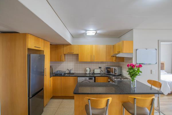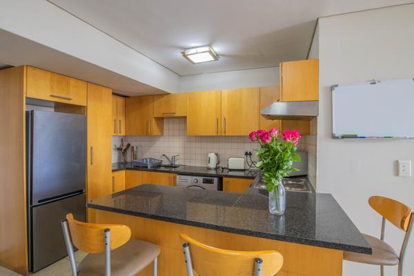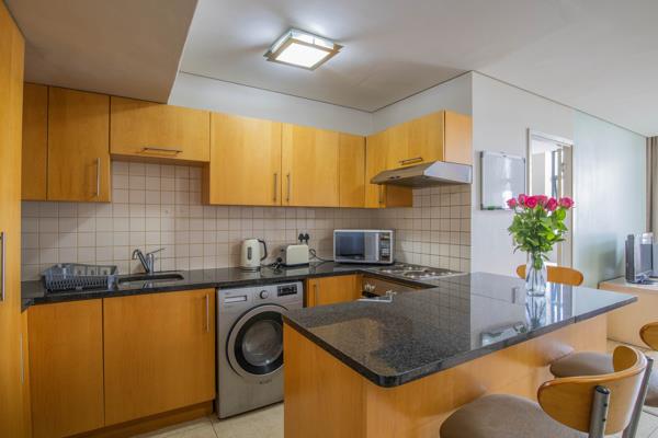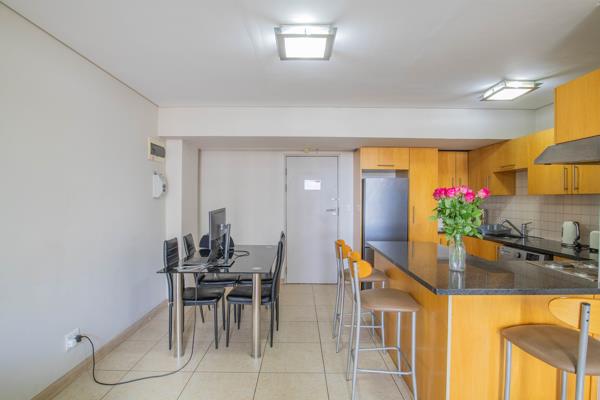 The apartment features an open-plan kitchen with granite countertops, ample built-in cupboards, oven, hob and extractor, and one plumbing point. The tiled and laminated livingdining area opens onto a balcony offering partial views of Table Mountain and the Foreshore City Centre.