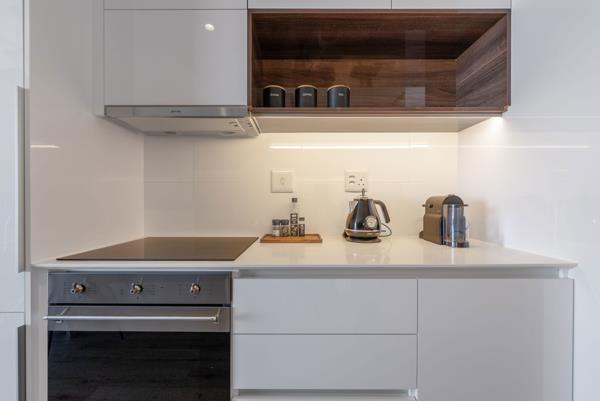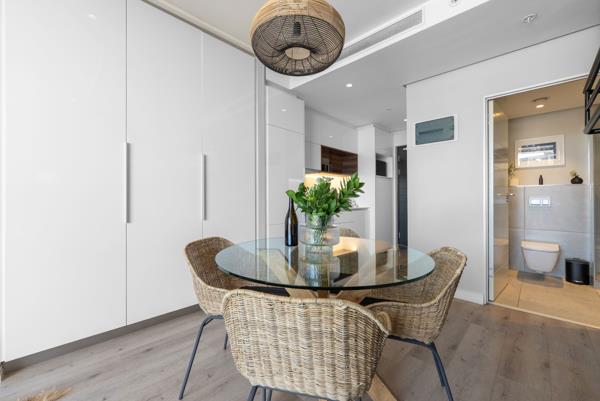 The open-plan layout is thoughtfully designed to maximize light, space, and comfort. Custom-made furniture, premium finishes, and quality stainless steel appliances create a sophisticated yet welcoming environment. The sleek kitchen flows into the living area, which opens onto a private balcony showcasing uninterrupted views from Table Mountain across the city to the Atlantic Ocean. Every detail has been curated to reflect contemporary elegance and effortless functionality.