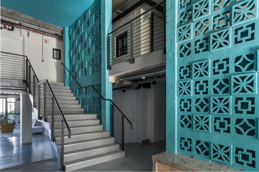 The Apartment is a symphony of Black, Greys & White with an Accent Teal Blue. Raw Boxed Concrete Ceilings with black Exposed Electric Tubing with lights in Black. Black Concrete Painted Floors Throughout.