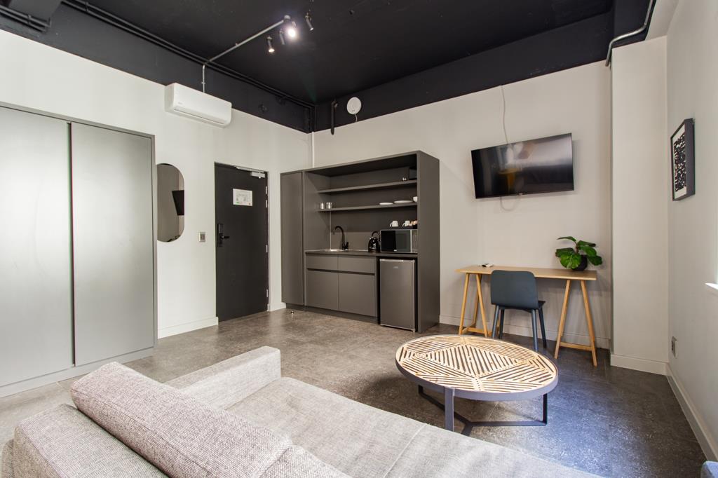 The studio features a modern open layout that maximizes space and natural light, creating a comfortable atmosphere for both relaxation and productivity. The design is contemporary, with high-quality finishes that complement the urban aesthetic.