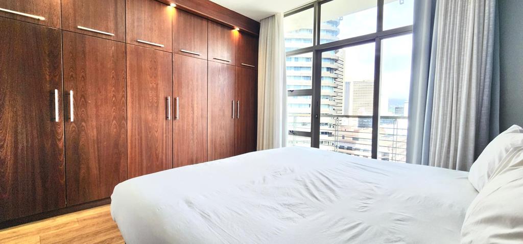Retreat to the spacious bedroom, complete with built-in wardrobes, ensuring ample storage. A chic bathroom complements the space with modern fittings. Enjoy breathtaking views of the iconic Table Mountain and the bustling city skyline from your private balcony.