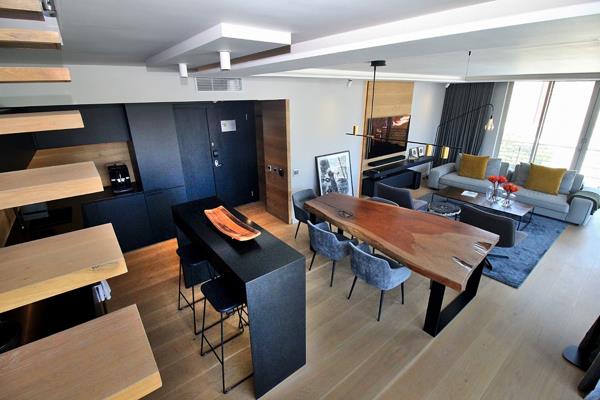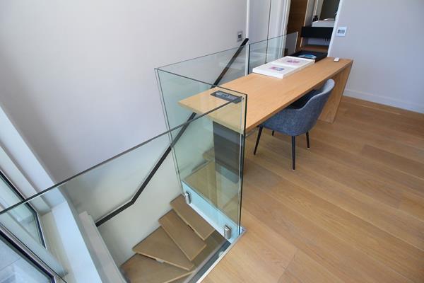 The same seamless design continues up the stairs to the two bedrooms, with an office area located on the upper level. Both bedrooms are ensuite. One bathroom features a bath, shower, double sink, and toilet, while the second has a shower, sink, and toilet. A guest toilet is also included, along with a built-in washing machine and tumble dryer. Two secure parking bays are available inside the building. Residents also have access to hotel amenities, including conference rooms, the Odeon Cinema, a spa, gym, sauna, and swimming pool. Contact us now to schedule your exclusive viewing.