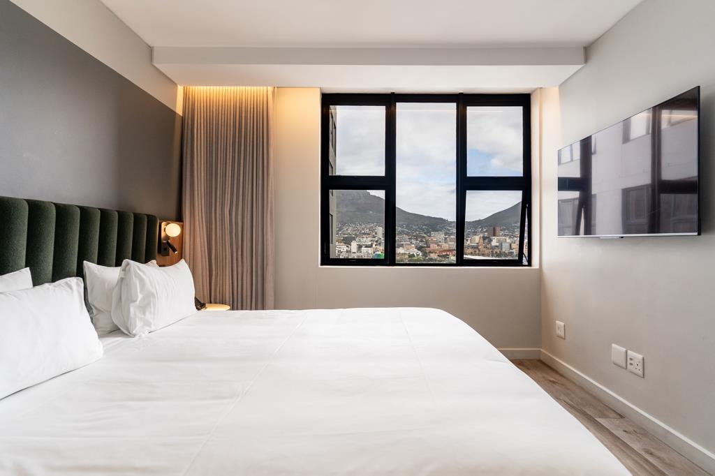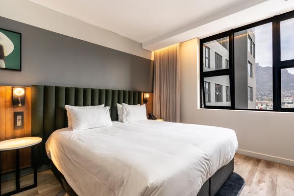 SOLE MANDATE | This Hotel-Style apartment is in The Rockefeller. The 1 bed apartment comes fully furnished with coffee & tea station and bar fridge. It is tastefully furnished and has mountain views. There is 24-hour security and concierge. The apartment has keyless entry and the building has high speed fibre connectivity throughout.