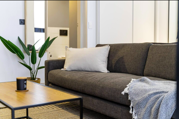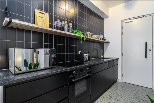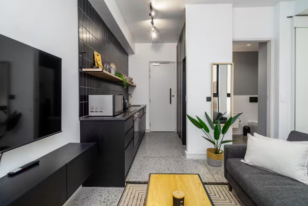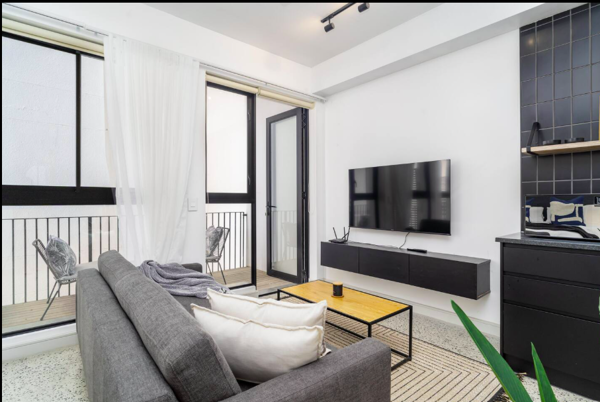 The apartment features an open-plan layout with high-end finishes throughout. Floor-to-ceiling windows allow for an abundance of natural light, while a private balcony offers an outdoor escape in the middle of the city. The fully equipped kitchen boasts premium appliances, including a sleek Smeg stove, complemented by top-quality furnishings and contemporary design.