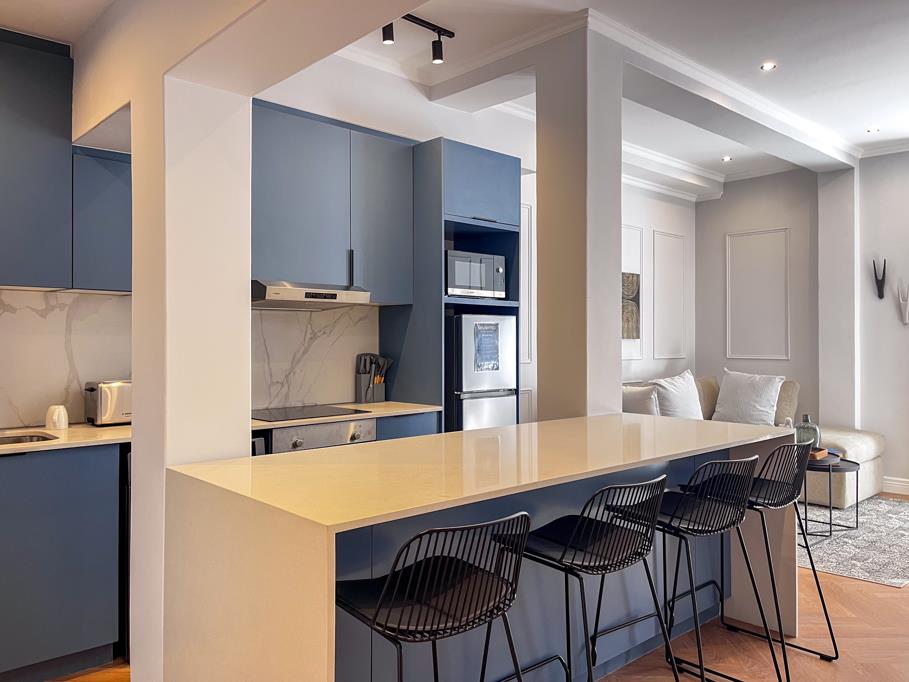 As you enter, you''re welcomed by a generously sized kitchen, boasting steel blue cabinetry, an integrated oven, and marble-look countertops. A spacious central island anchors the space, perfect for meal prep, casual dining, or entertaining. The living area flows to the right, filled with natural light and ideal for relaxing or working from home.