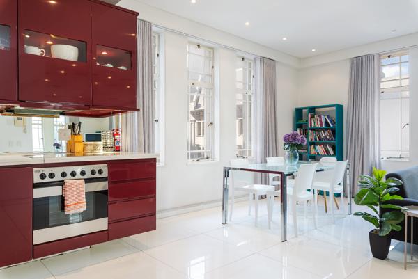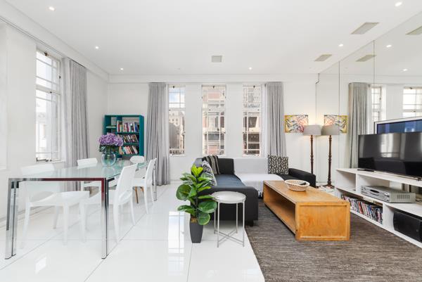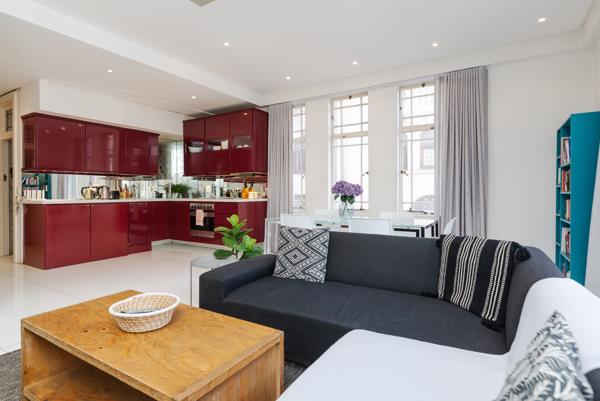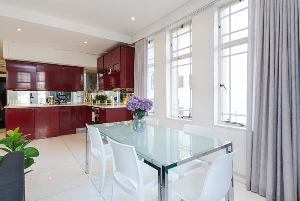 This north-east facing corner apartment enjoys natural light and sunrise views over Devils Peak. The open-plan living, dining, and kitchen area is bright and welcoming, with a mirrored wall that enhances the sense of space. Should you decide not to take advantage of one of the myriad of cafes and restaurants on your doorstep, the kitchen is well-appointed, offering generous storage, ample prep space, and a built-in dishwasher.