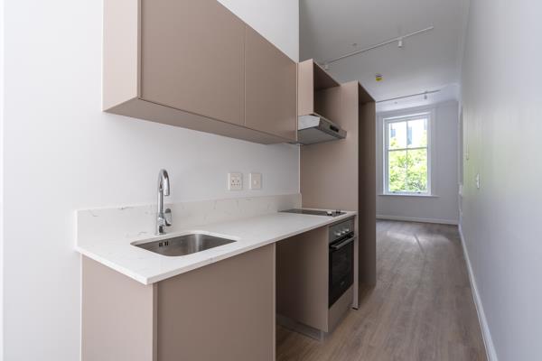 VAT Inclusive | No Transfer Costs. Discover effortless city living in this brand-new refurbished historic building development, perfectly positioned in the heart of Cape Towns City Centre, close to Green Market Square. This elegant studio apartment offers a bright, open-plan layout with floor-to-ceiling windows, allowing for an abundance of natural light. The modern kitchen features engineered stone countertops and high-quality finishes throughout, complemented by stylish vinyl flooring.