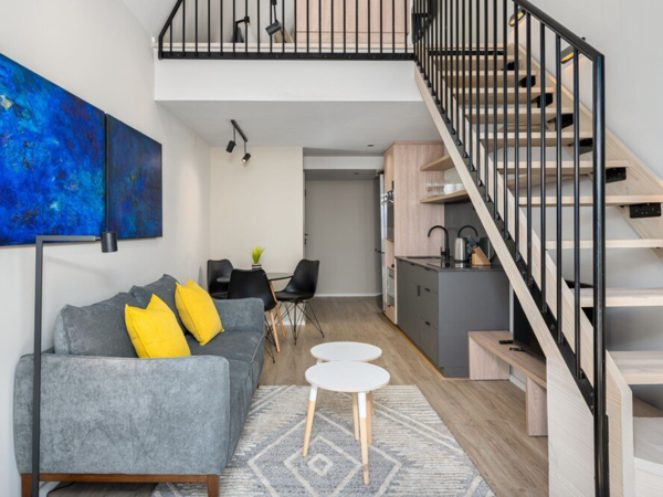 As you step inside, you''ll be greeted by an open plan double volume living area that leads out onto a generous North-East facing balcony with spectacular views over the Cape Town cityscape and down towards the working harbour. The high ceilings and large windows/ sliding door flood the space with natural light, creating a bright and airy atmosphere. The minimalist sleek and well-appointed kitchen features top-of-the-line appliances (SMEG oven & 2 plate hob), granite worksurfaces.