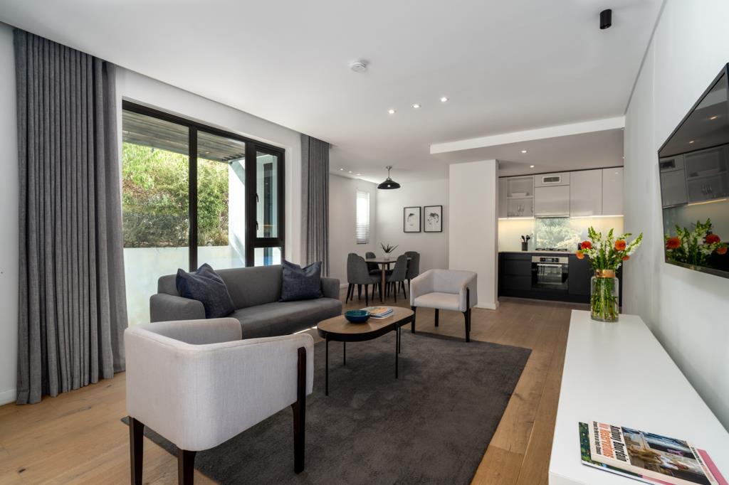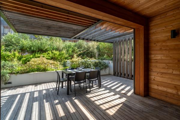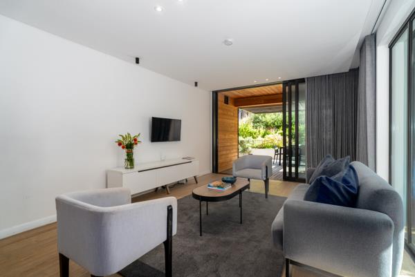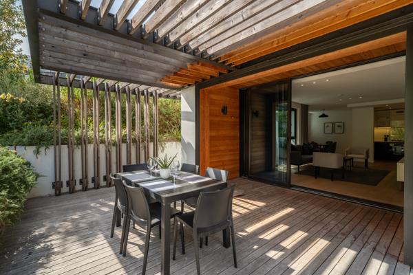 Open plan kitchen , dining and living area with floor-to-ceiling double glazed sliding doors to a sunny covered terrace.