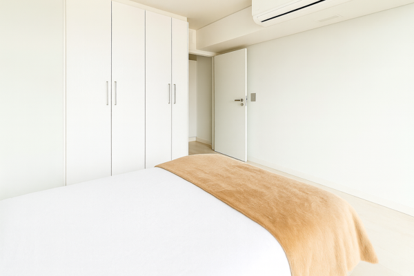 The main bedroom also faces the mountain, offering the same breathtaking view and its own air-conditioning unit. The second bedroom is generously sized and features built-in cupboards. The apartment includes a modern bathroom with a frameless glass shower, plus a separate guest loo for added convenience.